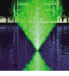 中心直上喷头是在同一个配水箱上安装许多万向直流喷嘴,当这些喷嘴规格相同时,喷出的水姿雄壮笔直;当这些喷嘴规格不完全相同时,大小喷嘴布设得当,喷出的水姿粗壮有力,层次分明、主题突出,是大型喷泉必备的主要喷头。该喷头也叫中心水柱。